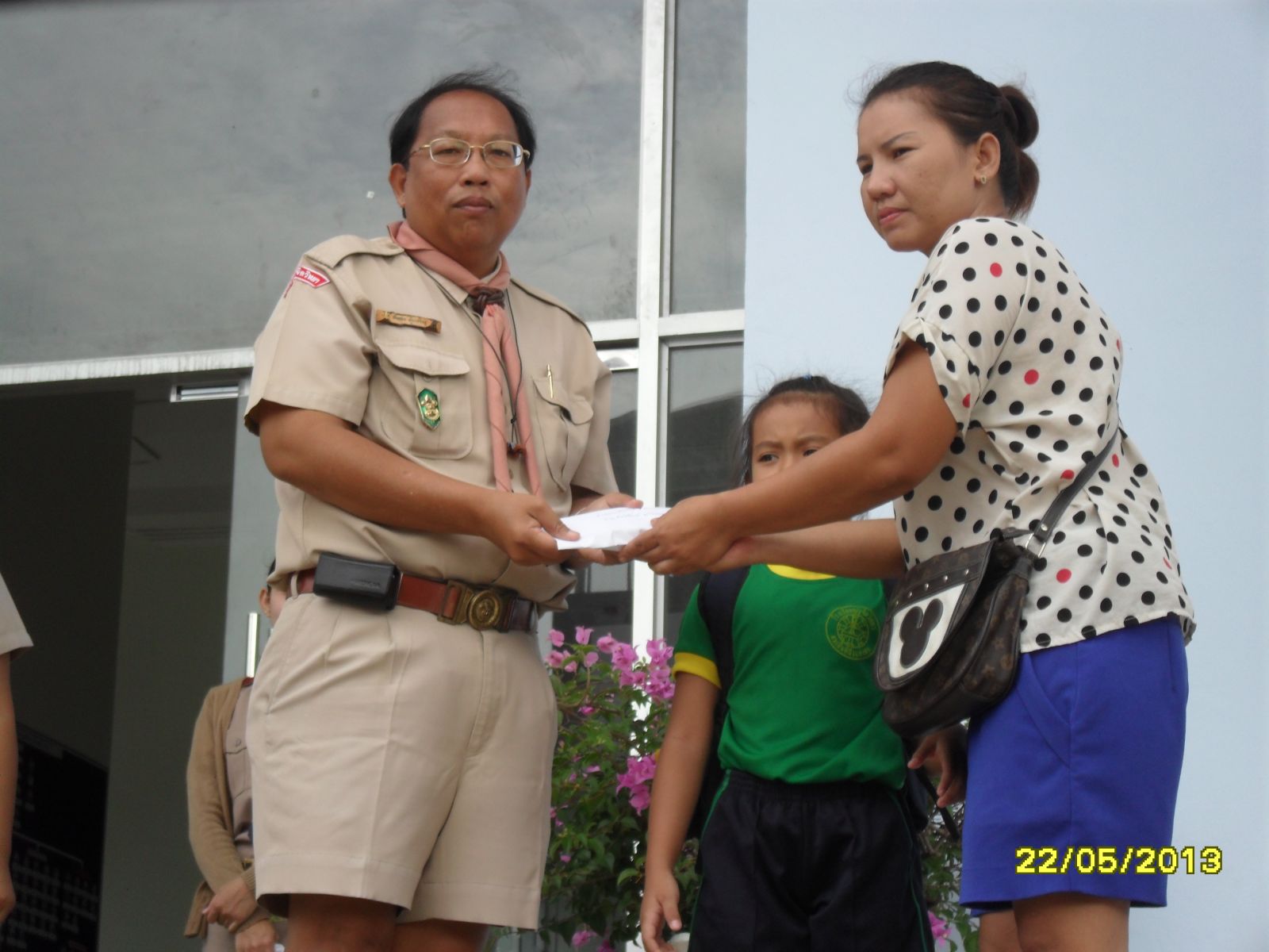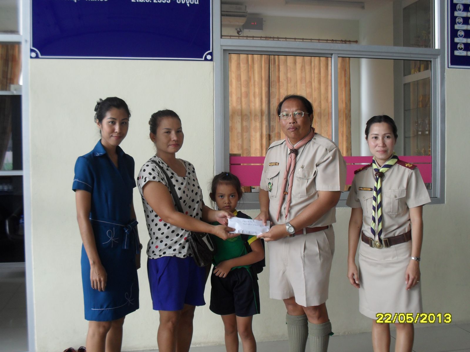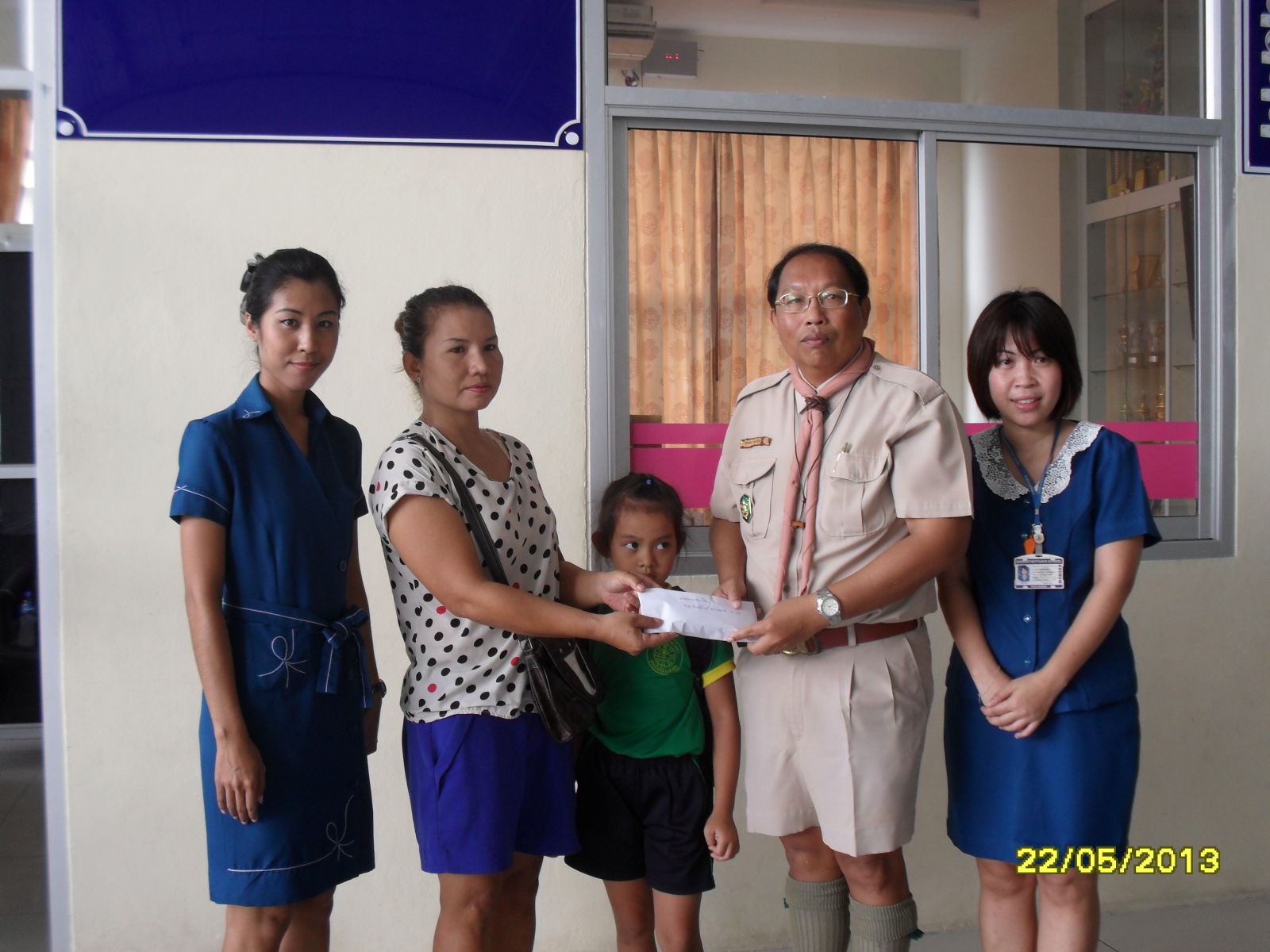 เมื่อวันที่ 22 พ.ค. 56 สนธยา ตุ๋นเจริญ ที่ปรึกษาคณะกรรมการบริหารโรงเรียนและนายกสมาคมผู้ปกครอง ครูและศิษย์เก่าโรงเรียนบุญจิตวิทยา เป็นตัวแทนมอบเงินช่วยเหลือครอบครัว ด.ญ.ภัทรนันท์ ด้วงลอย นักเรียนชั้นอนุบาล 3/2 ที่สูญเสียบิดาไปอย่างกะทันหัน...ภาพ/ข่าวโดยสนธยา