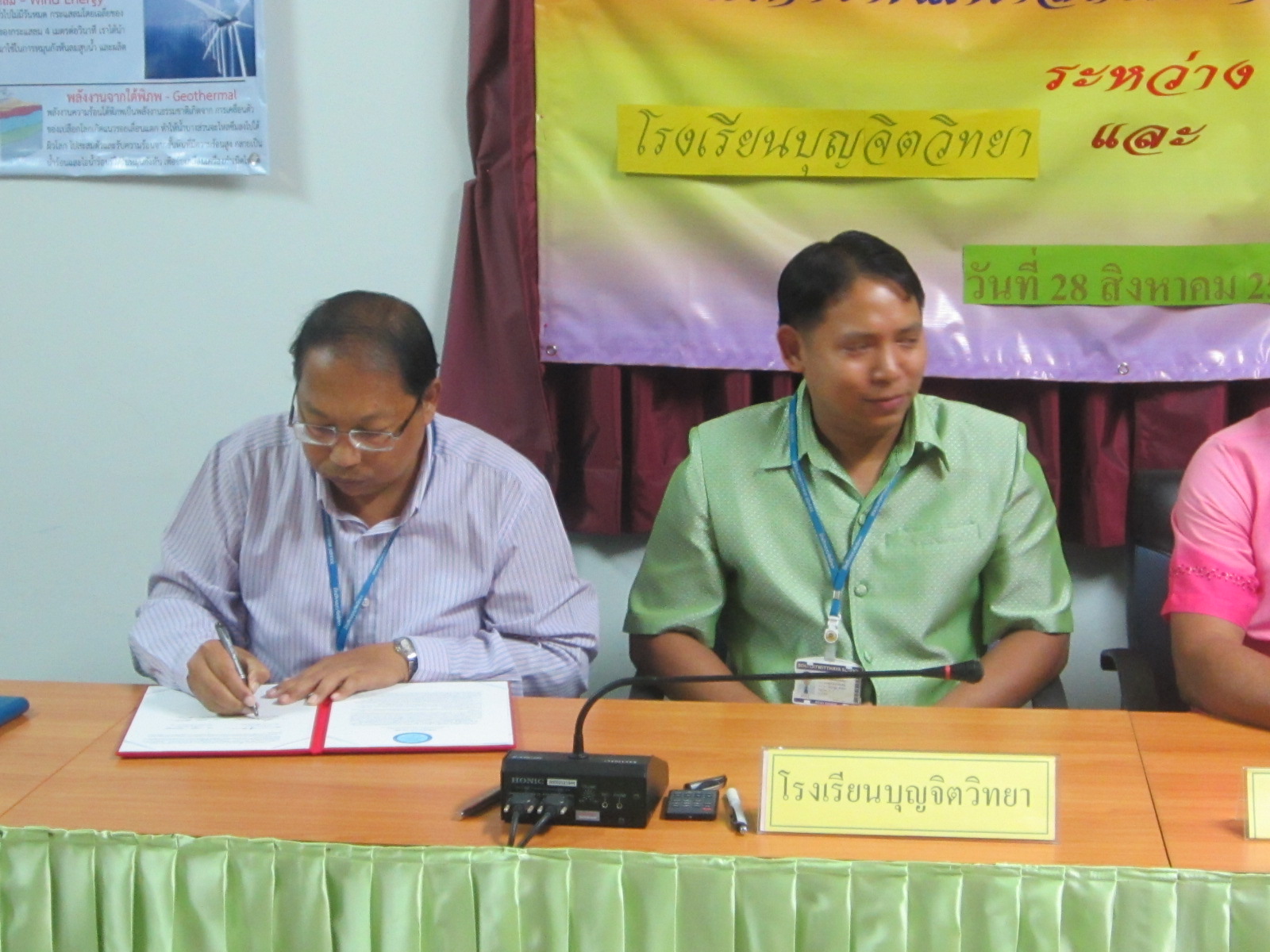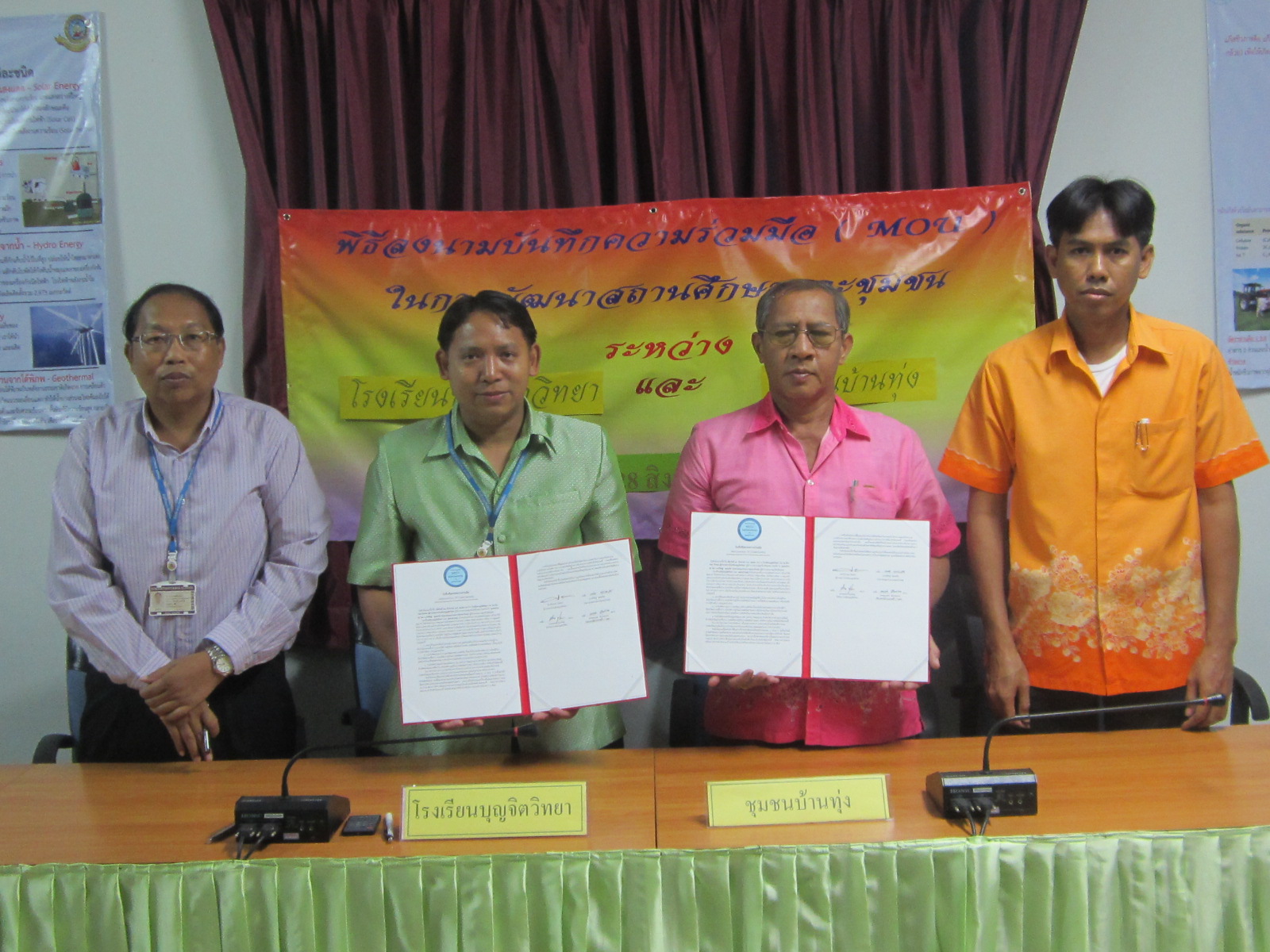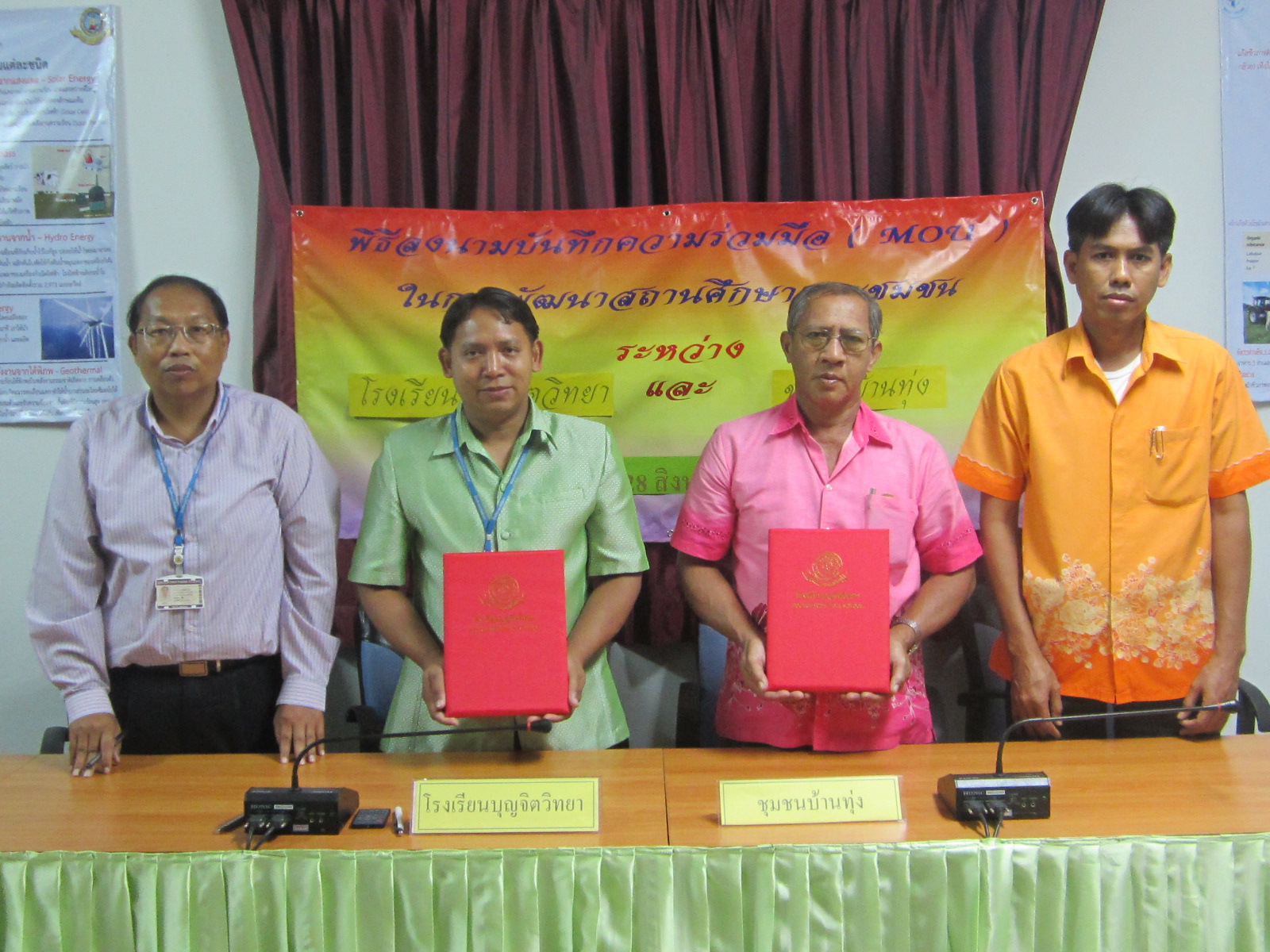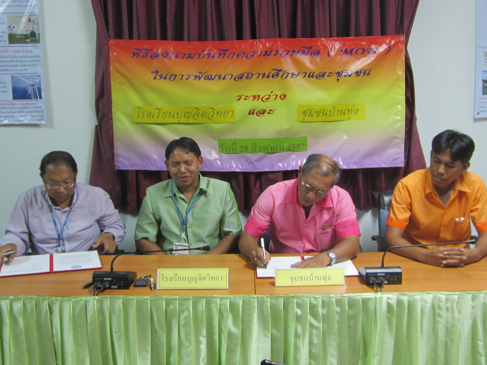 28 ส.ค. 57 โรงเรียนบุญจิตวิทยา โดย ดร.จักรกฤช กันทอง ผู้อำนวยการ อ.สนธบา ตุ๋นเจริญ ที่ปรึกษา ทำบันทึกความร่วมมือ (MOU) ในการพัฒนาสถานศึกษาและชุมชน กับ ชุมชนบ้านเขาน้ำซับ โดย นายวิศิษฐ์ พุทธตรัส ประธานชุมชน นายสมบูรณ์ เผือกสอาด เลขานุการ เป็นตัวแทนลงนาม