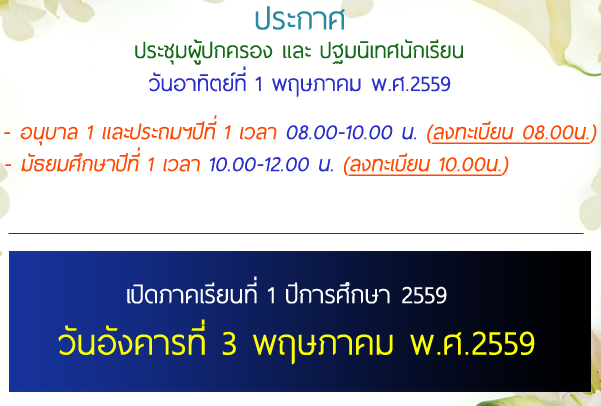 ประกาศประชุมผู้ปกครอง / ปฐมนิเทศ และประกาศวันเปิดภาคเรียน 2559