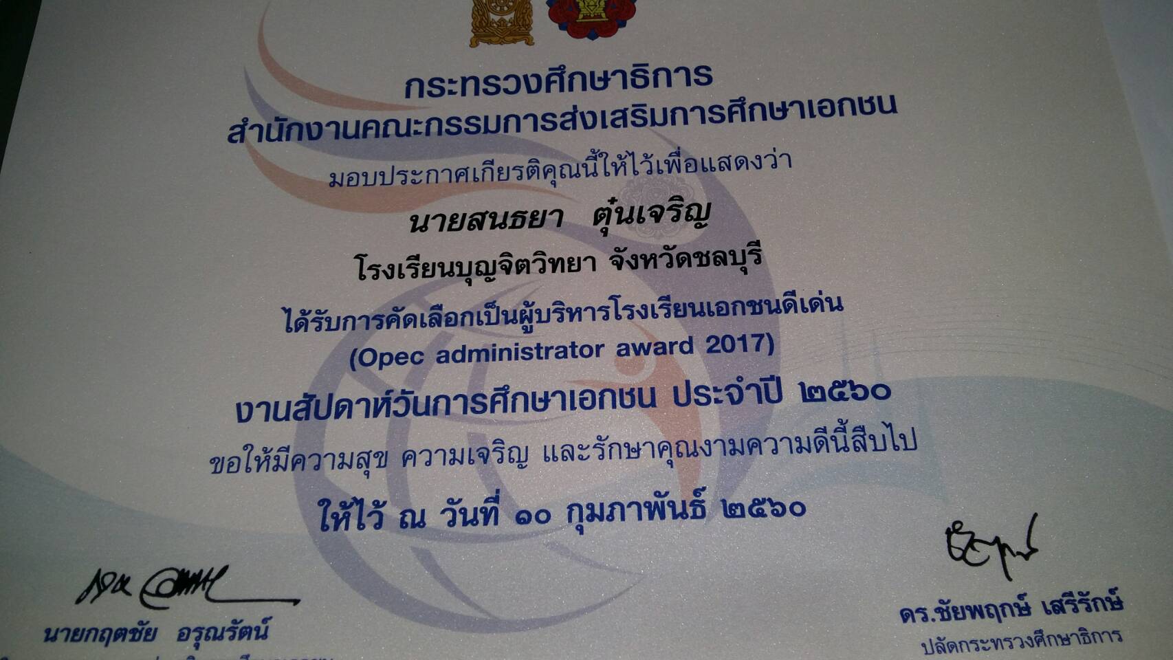 วันที่ 14 มีนาคม 2560 คณะครูโรงเรียนบุญจิตวิทยา รับเกียรติบัตร Opec teacher award 2017 งานสัปดาห์การศึกษาเอกชน ประจำปี 2560 โดยมีรายชื่อคณะครูดังนี้
